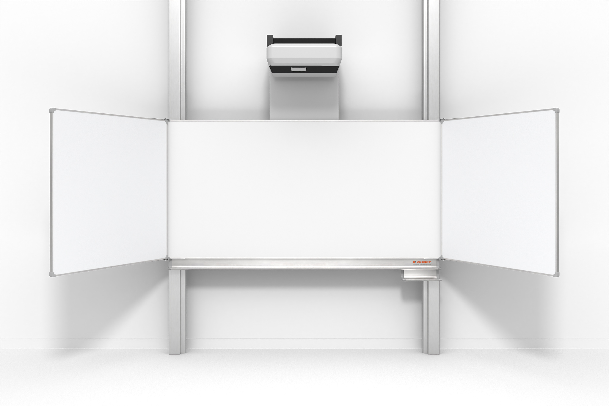 Interaktives Whiteboard mit Ultra-Kurzdistanzbeamer, der sich mit der Tafel höhenverschiebt. Durch die Montage über der Tafel entstehen keine Schatten. Als Klappschiebetafel mit 4 zusätzlichen Schreibflächen in der Farbe Ihrer Wahl.