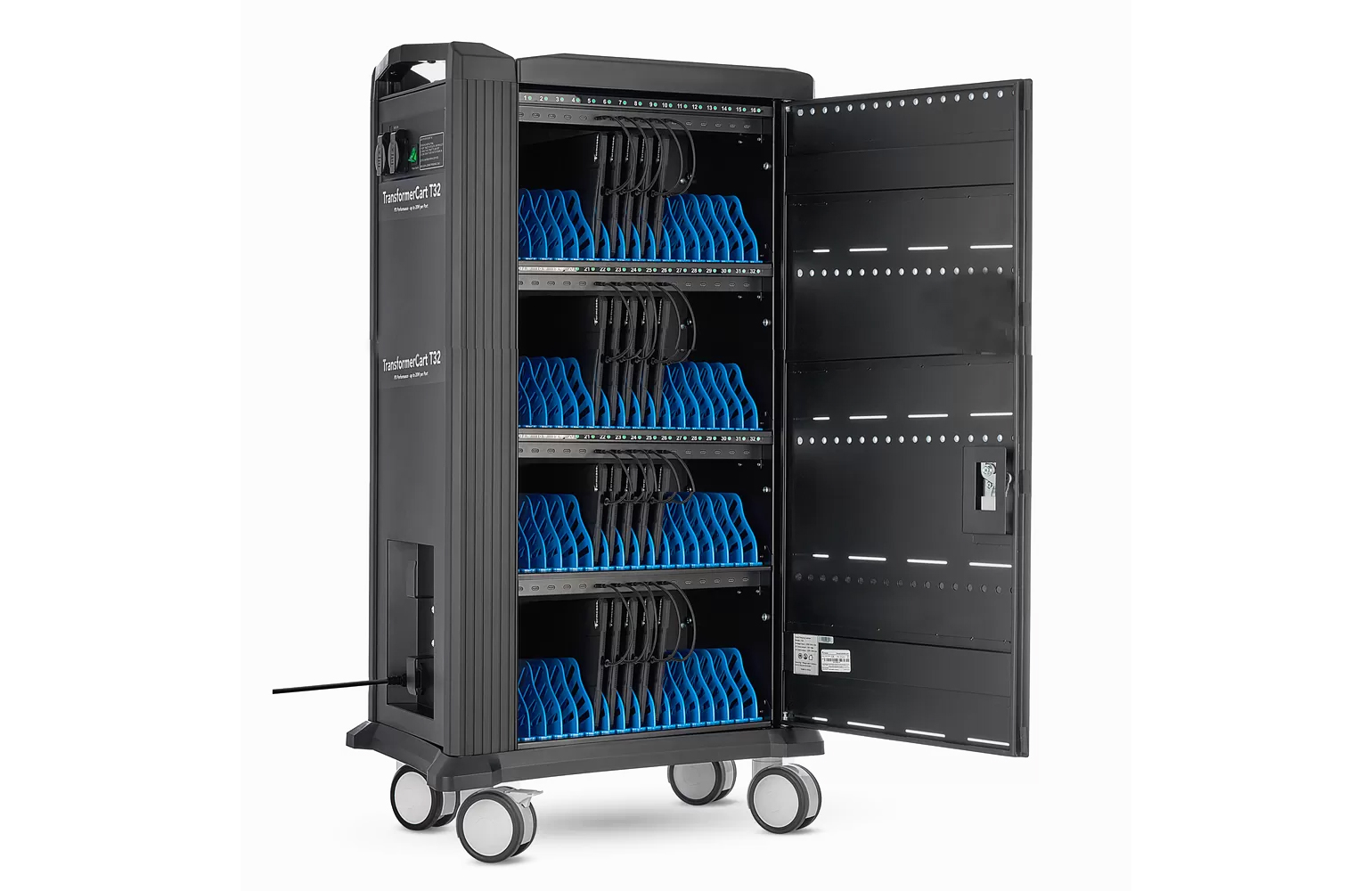 Der TransformerCart T64PD Performance ist ein leistungsstarker Medienwagen zur gleichzeitigen Aufbewahrung, Sicherung und Ladung von bis zu 64 Tablets oder iPads (bis 11") und eignet sich ideal für den täglichen Einsatz in Schulen, Hochschulen und professionellen Lernumgebungen. Dank 64 USB-C-Anschlüssen mit Power Delivery 3.0 und einer Ladeleistung von bis zu 20 W pro Port können alle Geräte zeitgleich und auch bei geschlossenem Gehäuse sicher geladen werden. Eine integrierte LED-Statusanzeige pro USB-Port ermöglicht jederzeit eine schnelle Übersicht über den Ladestatus, während ein aktives Belüftungssystem für einen sicheren und leisen Betrieb sorgt. Das abschließbare Metallgehäuse schützt die Geräte zuverlässig, und leichtgängige Rollen mit Feststellbremsen sowie versenkte Tragegriffe gewährleisten eine hohe Mobilität und sicheren Stand.