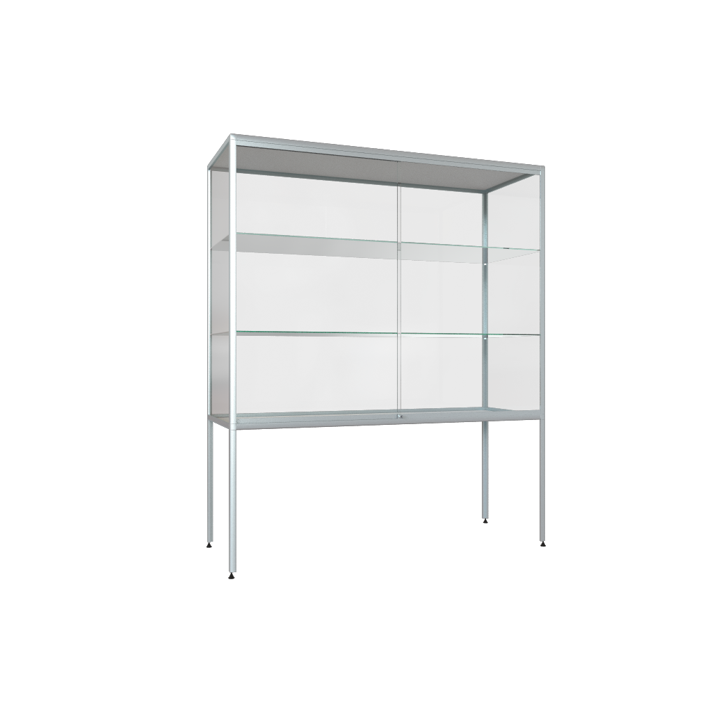 Diese hochwertige Glasvitrine mit Beinen überzeugt durch ihr klares Design und eine hochwertige Verarbeitung. Der stabile, abgerundete Aluminiumrahmen mit silberfarben eloxierter Oberfläche verleiht der Vitrine eine moderne, professionelle Erscheinung und sorgt gleichzeitig für hohe Stabilität und Schutz.