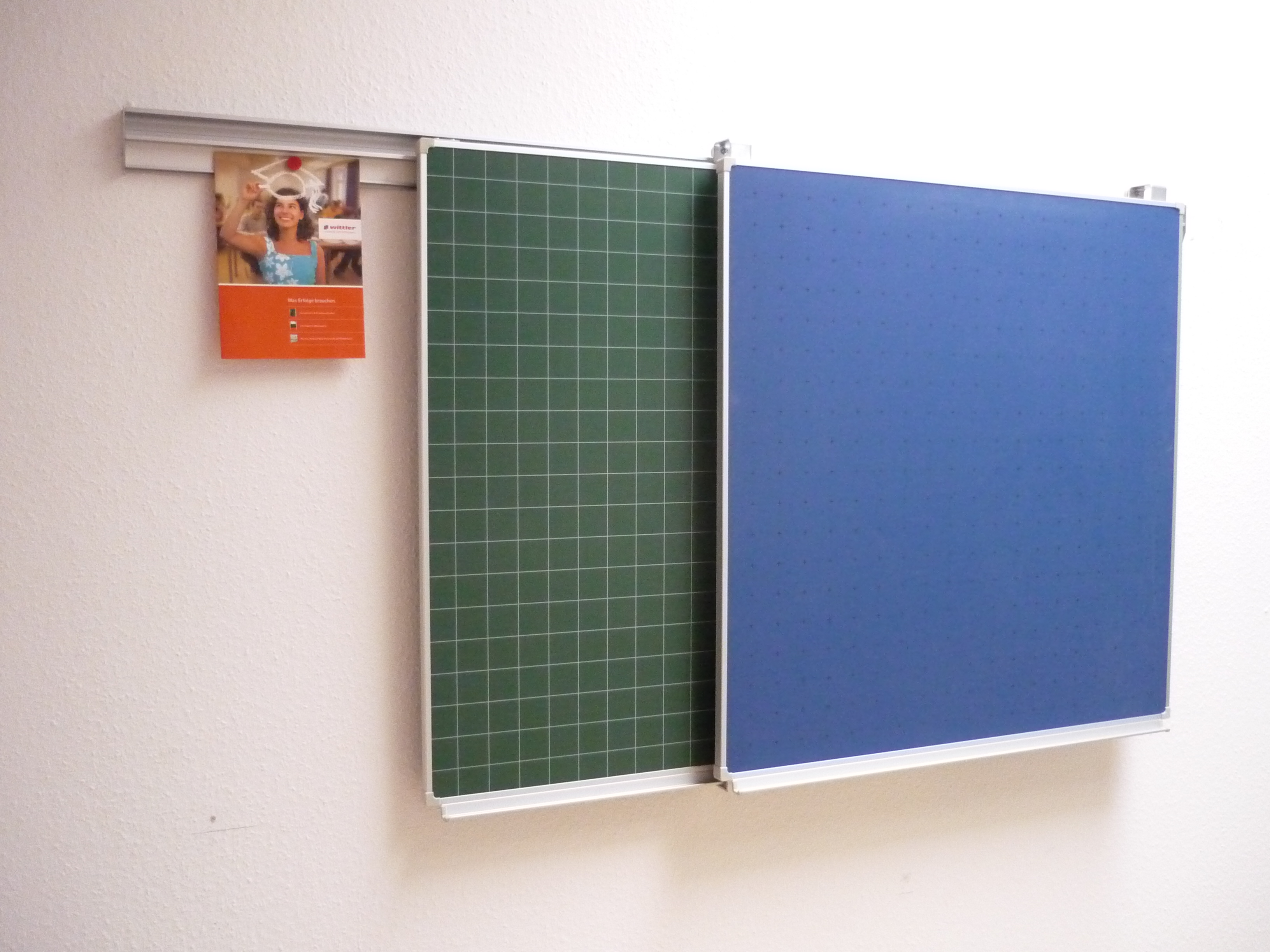 | Mechanik: | manuell, horizontal verschiebbar, Hängeleiste, Rollen an Tafelfläche |